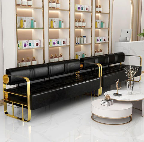 Chaise d'attente pour salon de coiffure Salon de beauté Magasin de vêtements Aire de repos Canapé doré en acier inoxydable Espace d'attente Banc long
